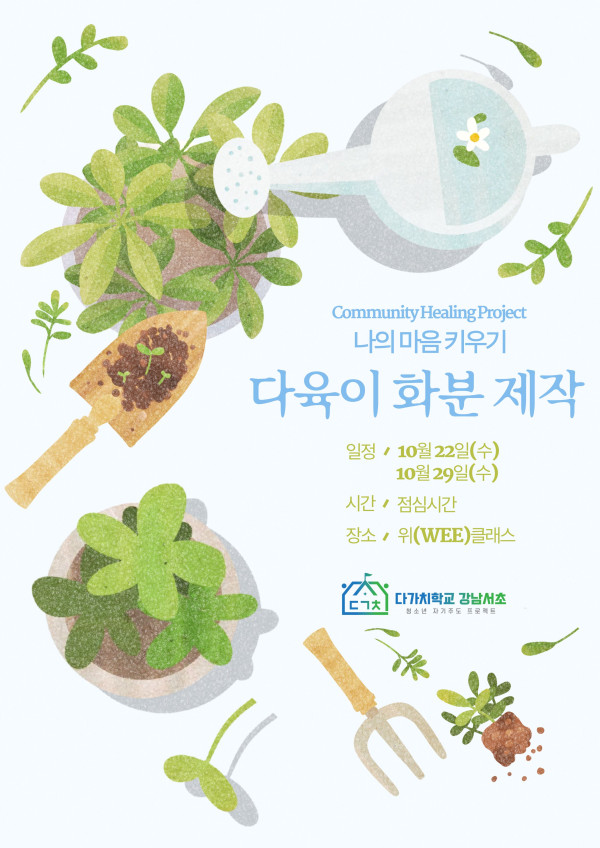 Community Healing Festival : 나의 마음 키우기 다육이 화분 제작 - 일정 : 2025년 10월 22일(수) / 10월 29일(수) - 시간 : 12:20 - 장소 : 다가치학교 강남서초(WEE클래스) - 대상 : 강남·서초구 지역주민 및 교사 등 |